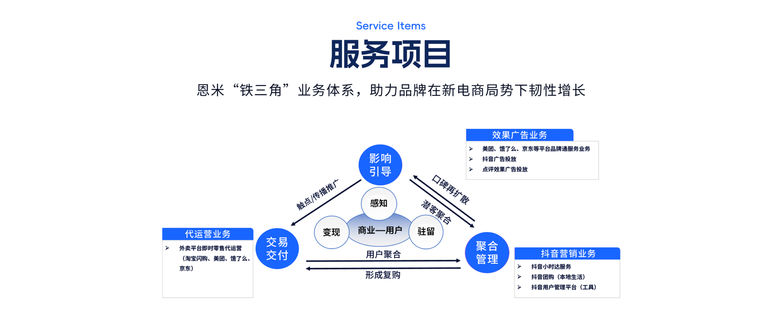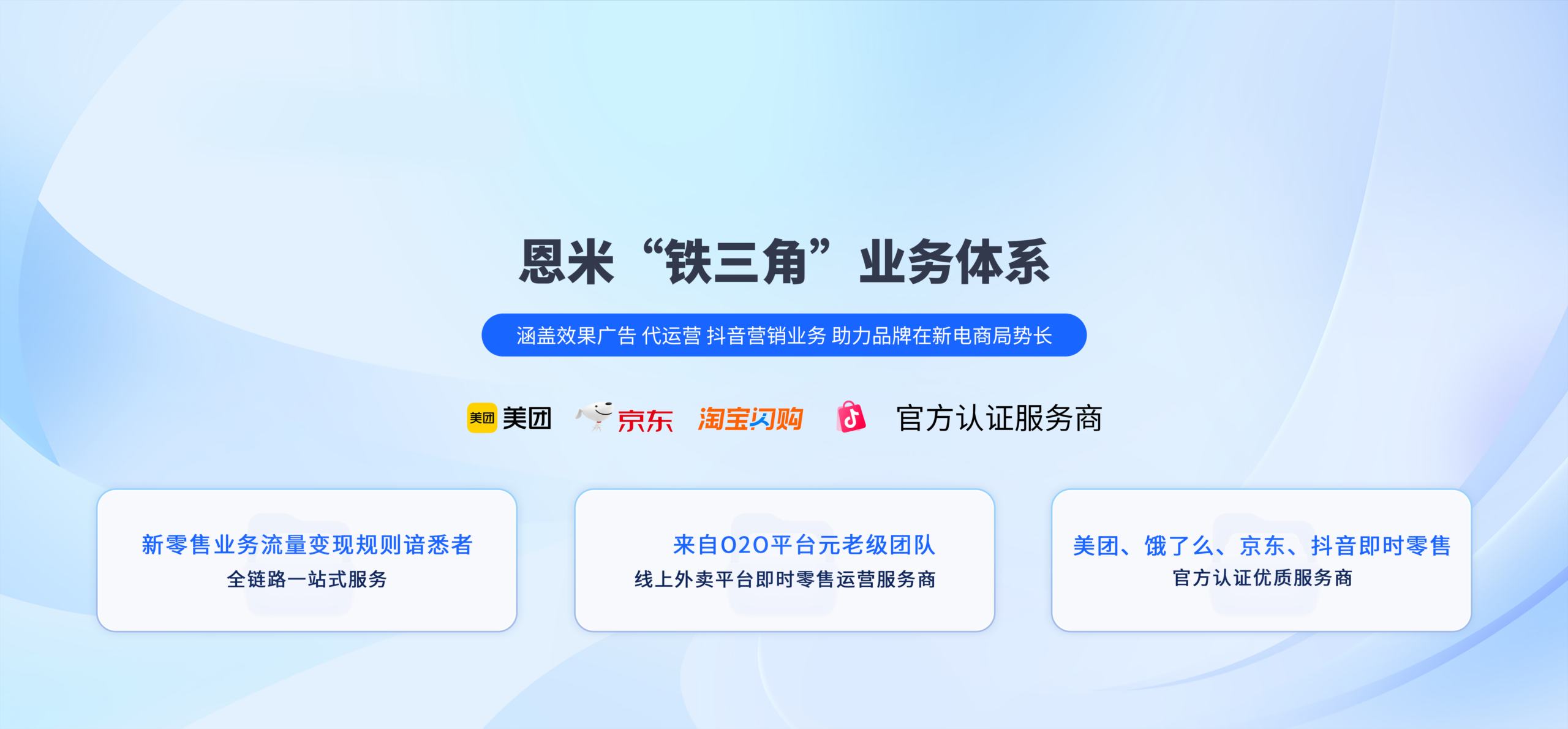 上海恩米网络科技有限公司成立于2018年,以帮助品牌零售企业在即时零售&本地生活O2O平台(淘宝闪购、美团闪购、京东到家、饿了么、抖音本地生活、抖音小时达)上找到新的业务增长点为使命,成为企业在新赛道领域的数字化全天候运营合作伙伴。 我们依托O2O平台的大数据分析与技术应用,为广大商户及品牌提供更全面的线上代运营服务解决方案。 我们正在打通行业的上下游,依据客户品类定制 “即时零售&本地生活”的平台系统化解决方案,通过整合优质资源,帮助企业将优质好货精准推送给广大消费者。